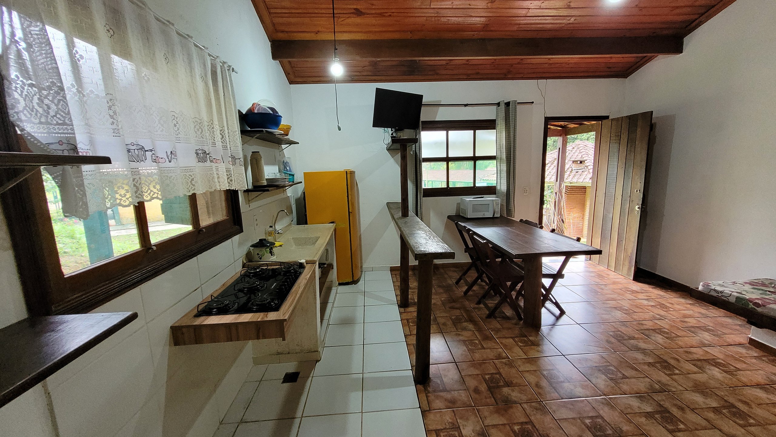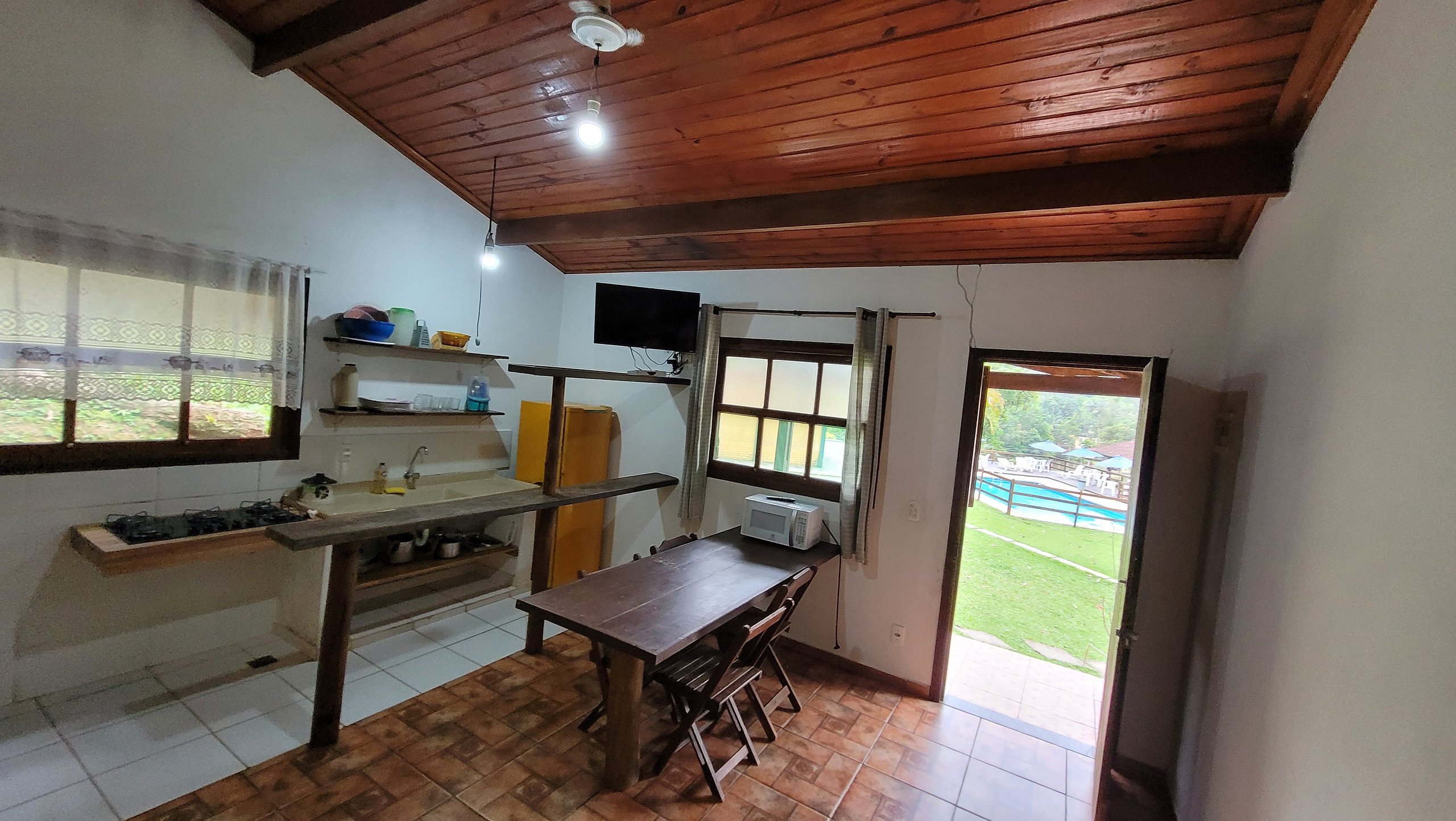 Chalé de 4 Adultos + 2 Crianças até 12 anos O Chalé de Casal + 2 Crianças até 12 anos possui uma cama de casal, cozinha independente completa, com geladeira, fogão, micro-ondas, pratos, panelas, utensílios em geral, banheiro, quarto e sala conjugados com TV com Sky e Netflix, ventilador de teto, cama de casal, 2 sofás cama de solteiro para as crianças, mesa com 4 cadeiras e prateleiras, área de serviço com tanque, varal nos fundos e varanda de frente para piscina, o chalé possui Wi-fi.